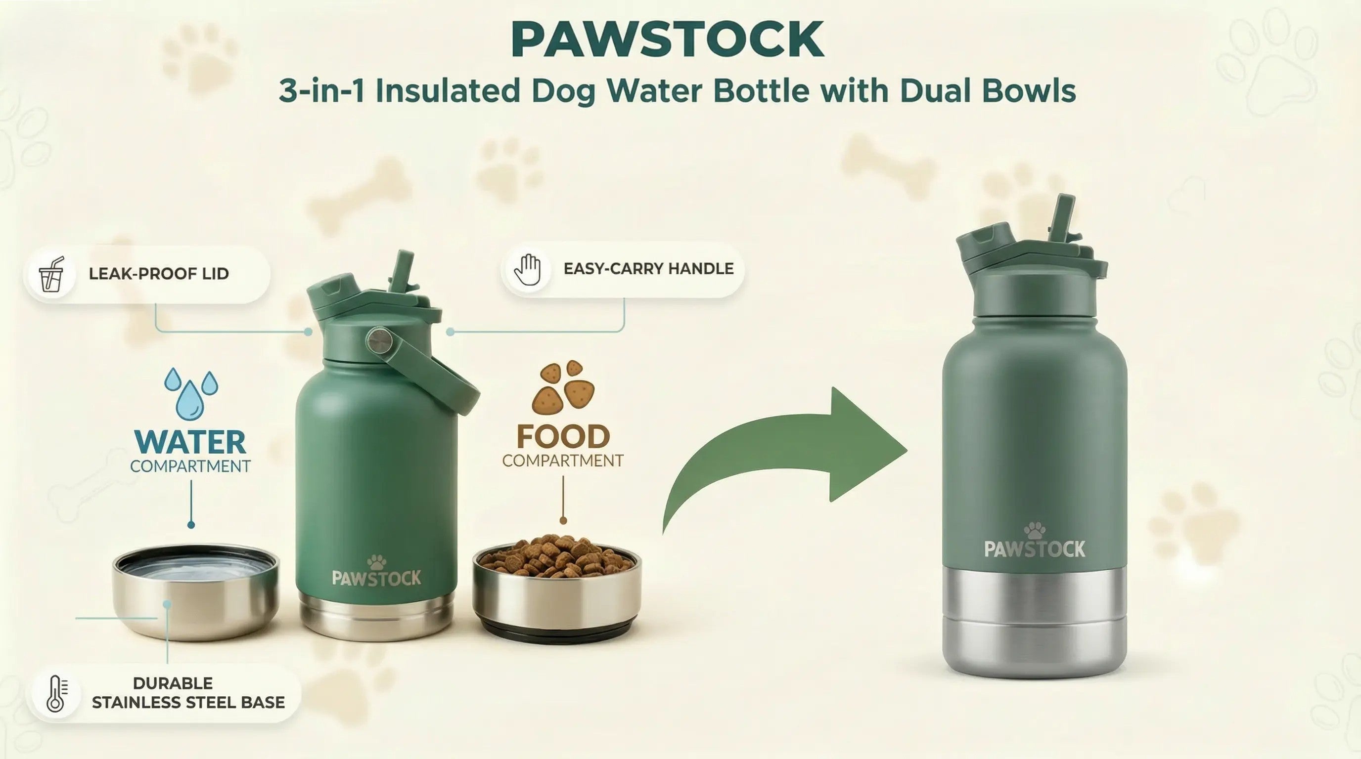 ✔ 3-in-1 Insulated Dog Water Bottle (1L Stainless Steel)